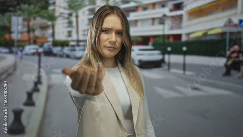 Young blonde woman gesturing on a busy city street with buildings and cars in the background pointing and inviting with hand implying connection and interaction in an urban outdoor setting