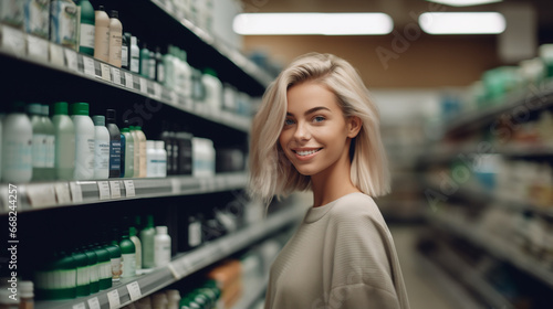 Young blonde woman happily shops for hair care products in store aisle