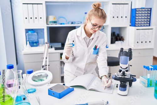 Young blonde woman scientist writing on notebook holding test tube at laboratory