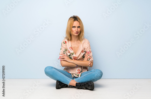 Young blonde woman sitting on the floor feeling upset