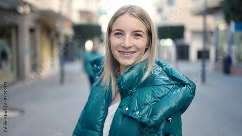 Young blonde woman smiling confident showing braces at street