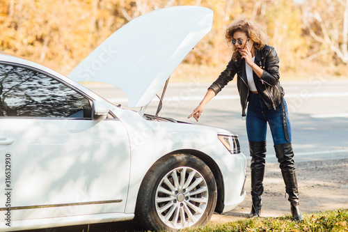 Young blonde woman standing near broken car with popped hood talking on her mobile phone while waiting for help.