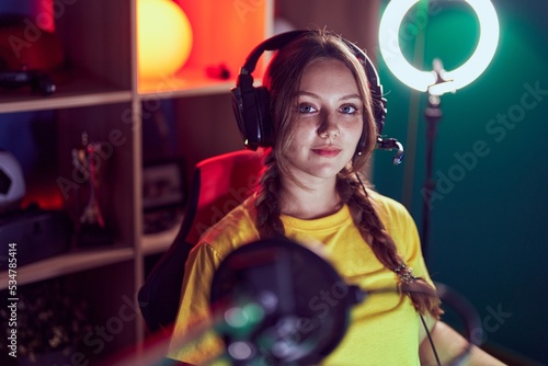 Young blonde woman streamer sitting on table with relaxed expression at gaming room