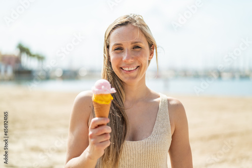 Young blonde woman with a cornet ice cream at outdoors smiling a lot