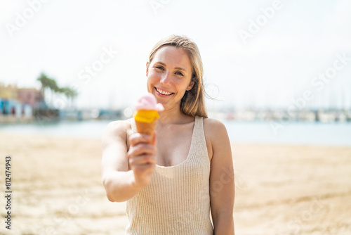 Young blonde woman with a cornet ice cream at outdoors with happy expression