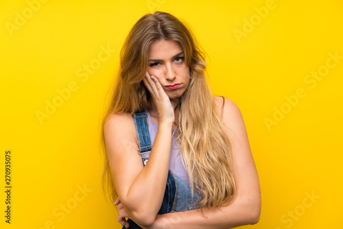 Young blonde woman with overalls over isolated yellow background unhappy and frustrated