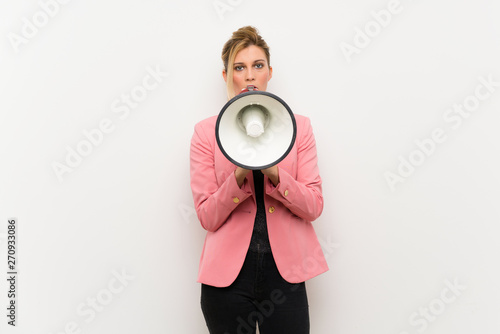 Young blonde woman with pink suit shouting through a megaphone