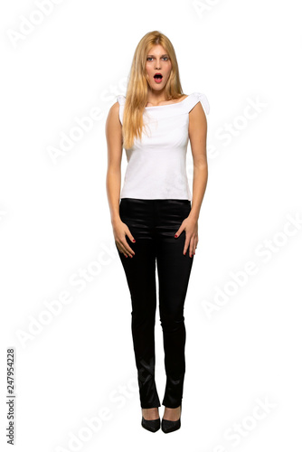 Young blonde woman with surprise and shocked facial expression over isolated white background