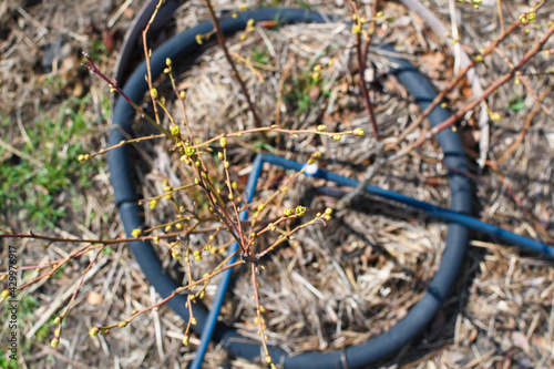Young blueberry bushes grow in soil with drip irrigation. Forest land. The soil is covered with mulch on top to protect and improve its properties. Spring work in the garden.