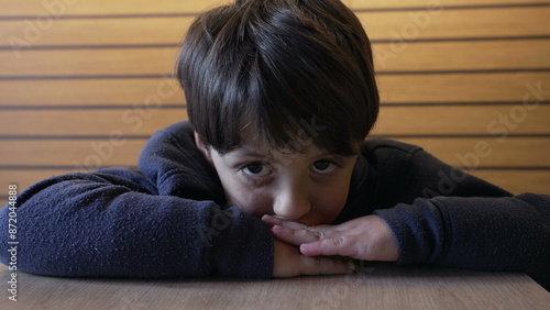 Young Boy Being Goofy and Playful, Resting His Head on a Table with a Fun Expression in a Casual Indoor Setting
