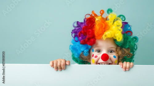 Young boy clown with a red nose and colorful wig hiding behind a blank sign.