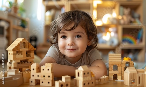 Young boy engaged in imaginative play with wooden blocks, constructing houses in a vibrant playroom. illustration images