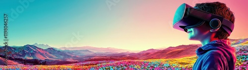 Young boy experiences immersive virtual reality in stunning colorful landscape filled with vibrant flowers and majestic mountains under a bright sky at sunset