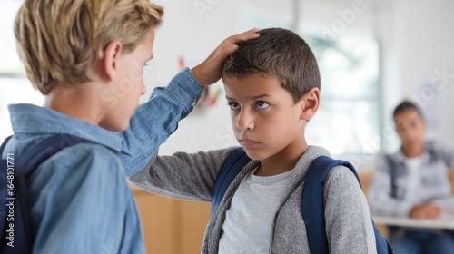 Young boy feels oppressed and tormented by another boy's hand touching his head in a classroom with others watching, conveying schoolyard mistreatment and harassment.