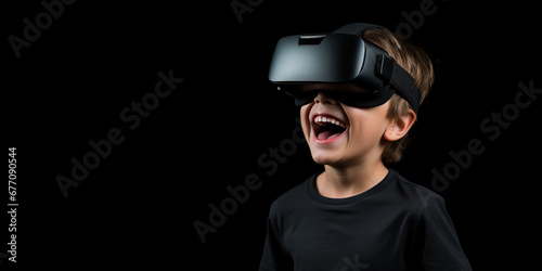 Young boy getting experience using VR headset glasses isolated on a black background with copy space