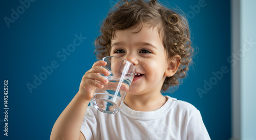 Young boy happily drinking water.