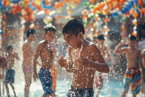 Young boy having fun in a fountain, suitable for summer activities concept
