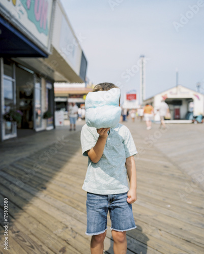 Young boy hiding behind his cotton candy on a Jersey Shore boardwalk