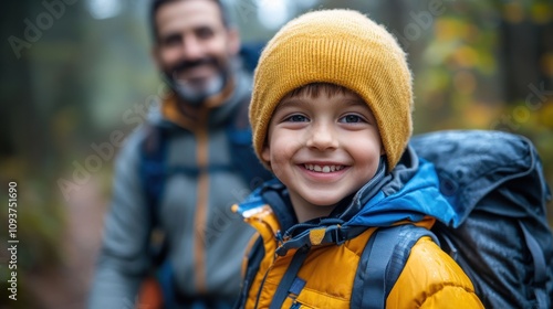 Young boy in yellow jacket smiling outdoors, autumn hike, beanie hat, backpack, cheerful child, nature walk, enjoying cool weather, outdoor adventure, family trip