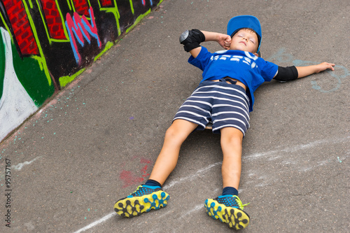Young Boy Lying on Back in Lot near Graffiti Wall