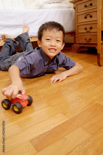 Young boy lying on floor with toy, looking at camera