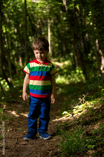 young boy playing in the green forest