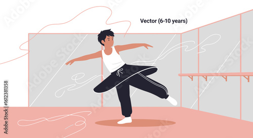 Young Boy Practices Ballet Technique And Gracefully Performs An Arabesque Pose