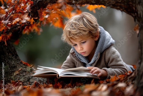Young boy reading a book surrounded by autumn leaves in a serene natural setting
