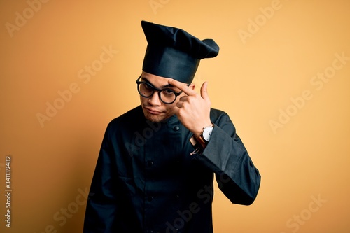 Young brazilian chef man wearing cooker uniform and hat over isolated yellow background pointing unhappy to pimple on forehead, ugly infection of blackhead. Acne and skin problem