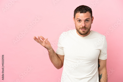 Young Brazilian man isolated on pink background making doubts gesture