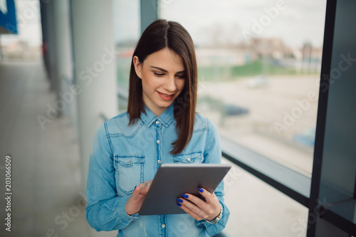 Young brunette is browsing internet on her tablet while she stands in corridor