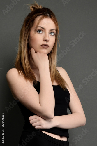 Young brunette lady posing on grey background