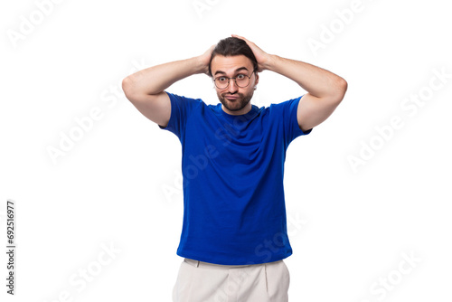 young brunette man with a beard dressed in a blue t-shirt thinks about solving problems on a white background