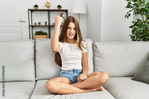 Young brunette teenager sitting on the sofa at home angry and mad raising fist frustrated and furious while shouting with anger. rage and aggressive concept.