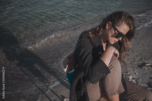 young brunette with long hair in a dark jacket and trousers in sunglasses with a chair on the seashore