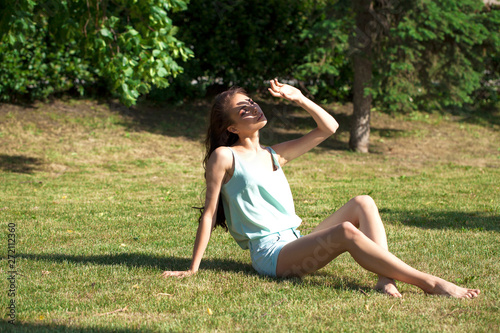 Young brunette woman in a turquoise blouse posing sitting on a green lawn in a summer park