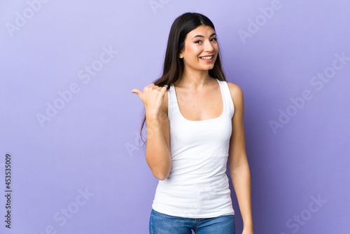Young brunette woman over isolated purple background pointing to the side to present a product