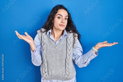 Young brunette woman standing over blue background clueless and confused expression with arms and hands raised. doubt concept.