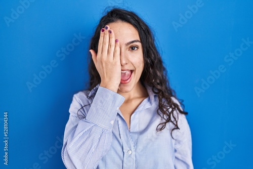 Young brunette woman standing over blue background covering one eye with hand, confident smile on face and surprise emotion.
