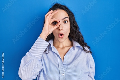 Young brunette woman standing over blue background doing ok gesture shocked with surprised face, eye looking through fingers. unbelieving expression.