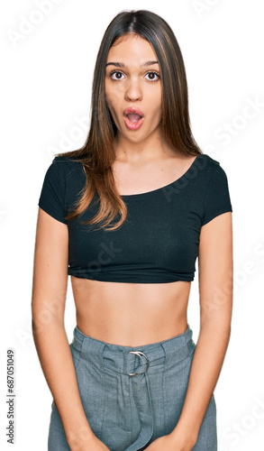 Young brunette woman wearing casual clothes afraid and shocked with surprise expression, fear and excited face.
