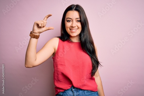 Young brunette woman wearing casual summer shirt over pink isolated background smiling and confident gesturing with hand doing small size sign with fingers looking and the camera. Measure concept.