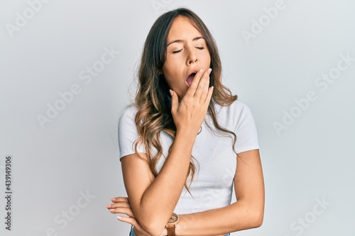 Young brunette woman wearing casual white t shirt bored yawning tired covering mouth with hand. restless and sleepiness.