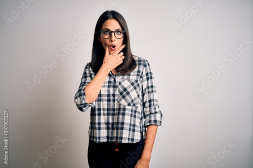 Young brunette woman with blue eyes wearing casual shirt and glasses over white background Looking fascinated with disbelief, surprise and amazed expression with hands on chin