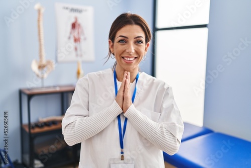 Young brunette woman working at pain recovery clinic praying with hands together asking for forgiveness smiling confident.