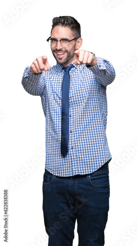 Young business man wearing glasses over isolated background Pointing to you and the camera with fingers, smiling positive and cheerful