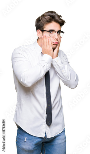 Young business man wearing glasses over isolated background Tired hands covering face, depression and sadness, upset and irritated for problem