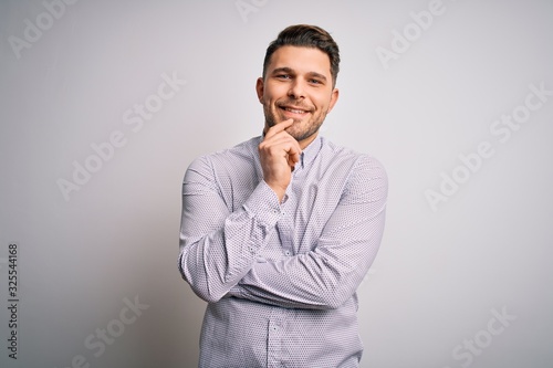 Young business man with blue eyes standing over isolated background looking confident at the camera with smile with crossed arms and hand raised on chin. Thinking positive.