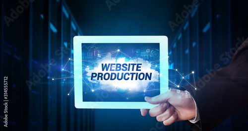 Young business person working on tablet and shows the inscription: WEBSITE PRODUCTION