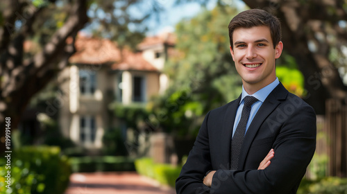 Young business professional in suit on campus grounds. Suitable for education management, academic leadership, or professional development.